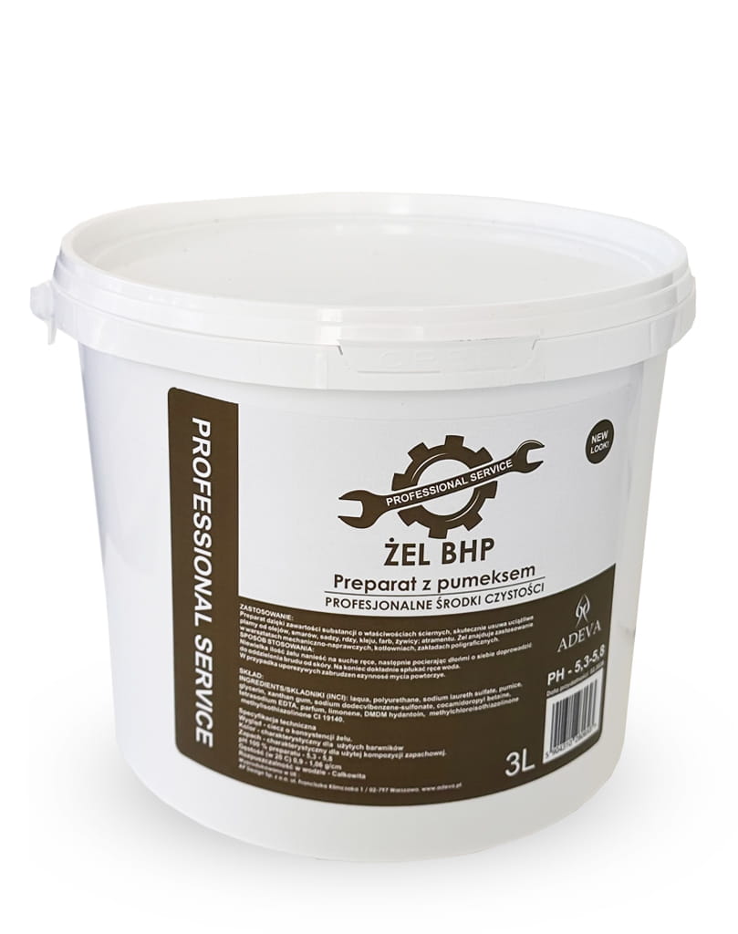 ŻEL BHP PREPARAT Z PUMEKSEM: Żel dzięki zawartości substancji o właściwościach ściernych, preparat skutecznie usuwa uciążliwe plamy od olejów, smarów, sadzy, rdzy, kleju, farb, żywicy; atramentu. Żel znajduje zastosowanie w warsztatach